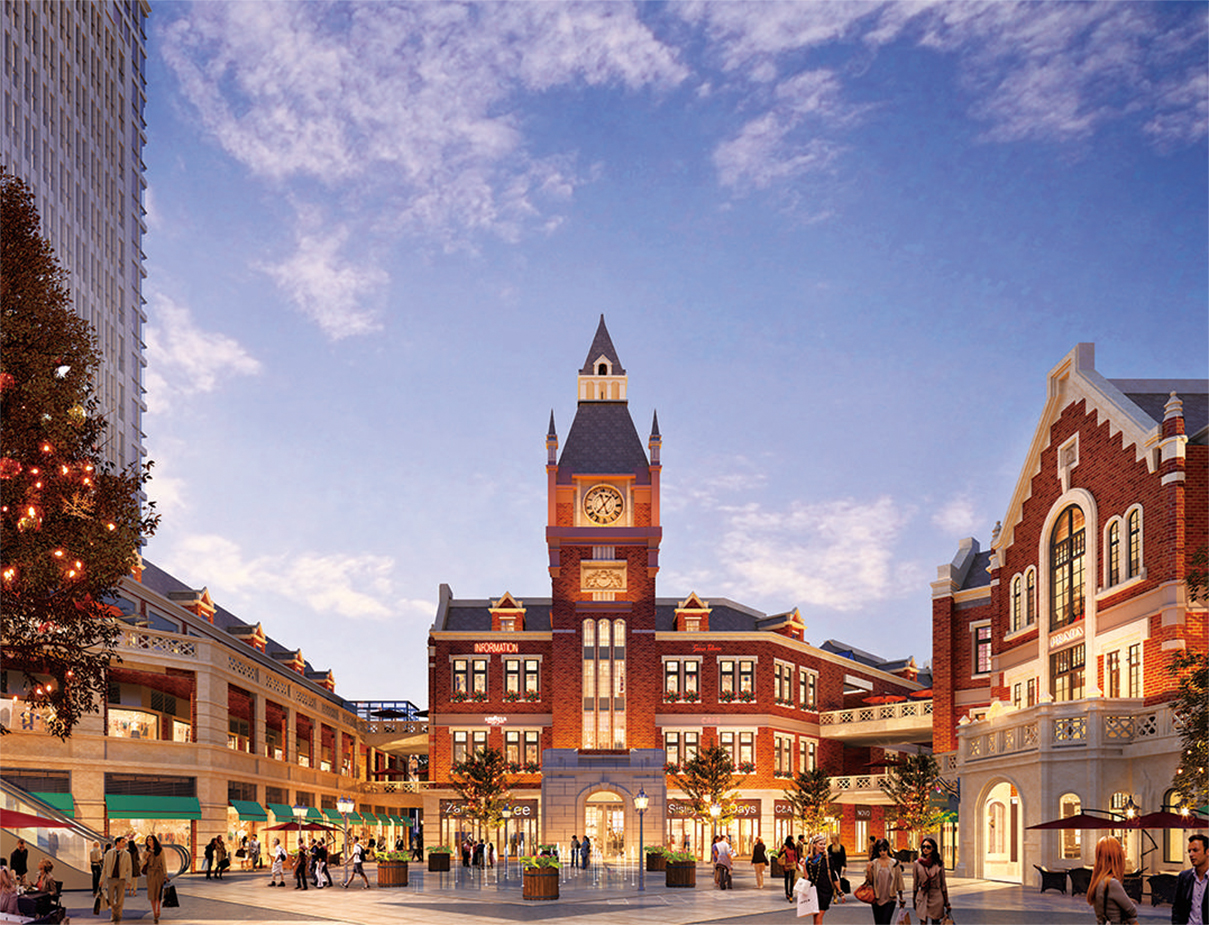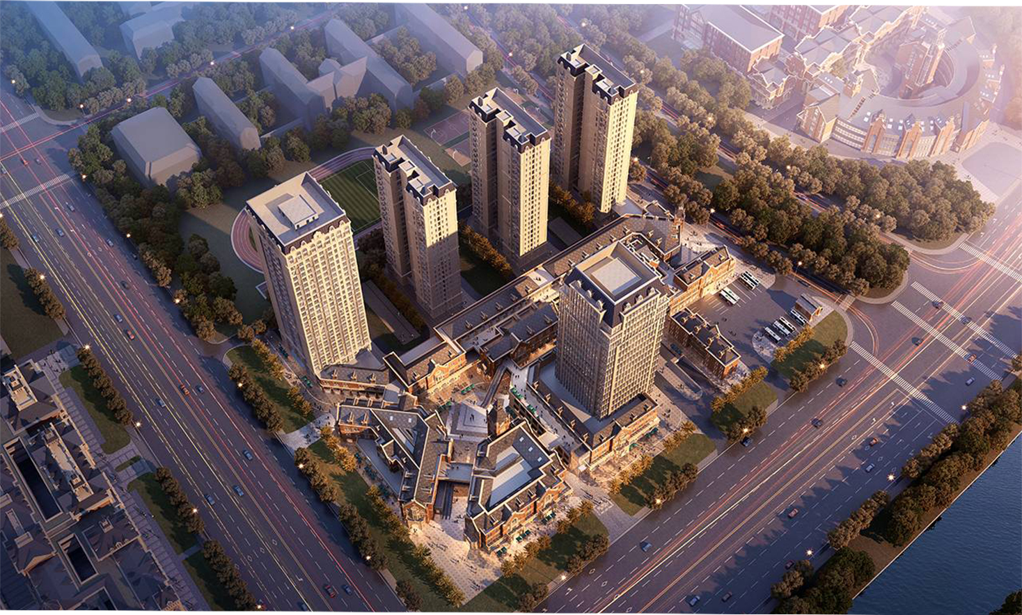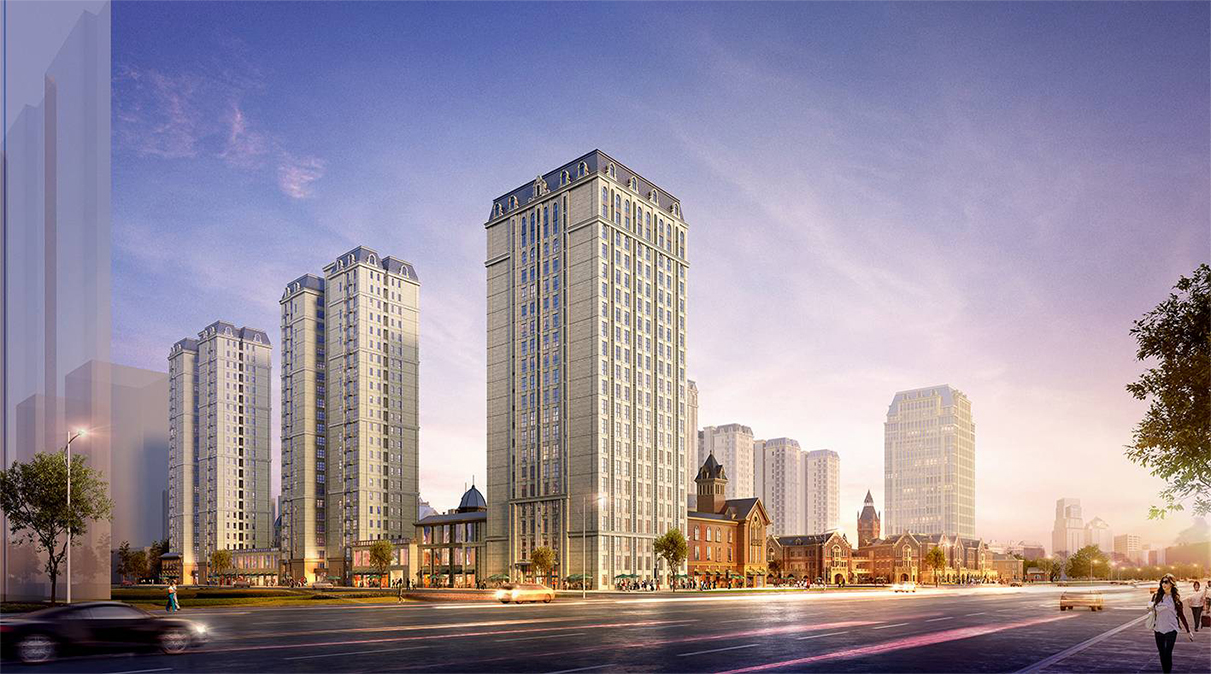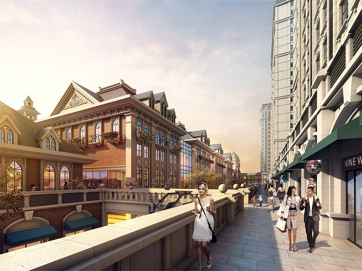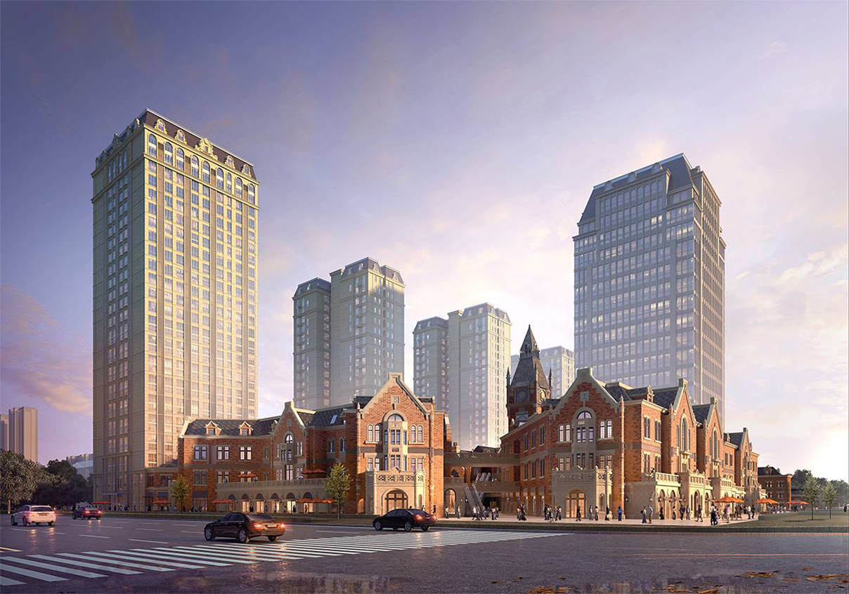 本項(xiàng)目的設(shè)計(jì)不僅關(guān)注構(gòu)建建筑,更注重于營造空間,打造體驗(yàn)。設(shè)計(jì)師通過營造引人矚目、優(yōu)雅浪漫的步行街道空間來豐富人們的商業(yè)體驗(yàn)。同時(shí),設(shè)計(jì)師賦予了建筑歷史厚重感,恰如其分地將歐式風(fēng)格與商業(yè)氛圍融合在一起。商業(yè)部分以優(yōu)雅、浪漫為主要基調(diào),采用了段落式重復(fù)狀的開窗形式以及局部色彩小面積變化的表現(xiàn)方式;裝飾采用的是顏色莊重大氣的石材或仿古石材裝飾面;細(xì)節(jié)處理部分運(yùn)用柱廊、雕花、線條、鐵藝等形式,呈現(xiàn)出浪漫典雅的風(fēng)格,追求建筑的詩意;屋頂部分則采用坡度且有轉(zhuǎn)折的屋頂形式,意在打造一個(gè)具有歐式風(fēng)情街區(qū)的建筑形象。