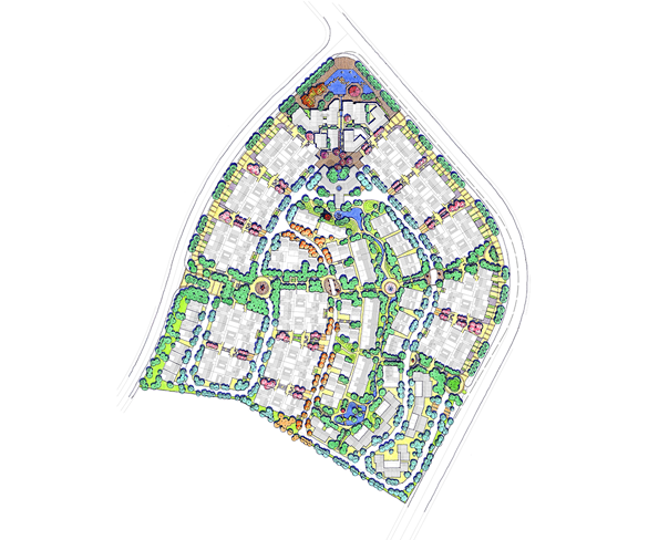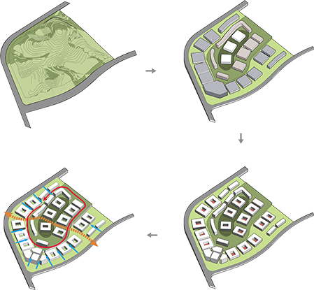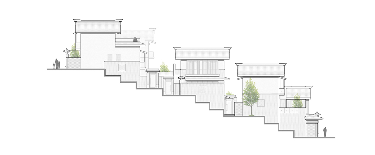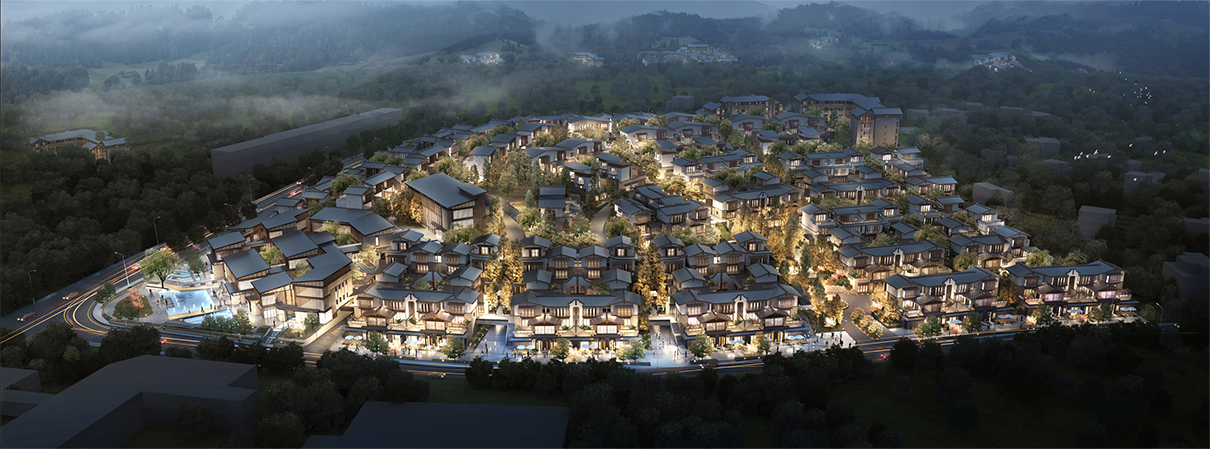 整體規(guī)劃采用大開放小圍合的設(shè)計(jì)理念,開放的山街步道與相對獨(dú)立的組團(tuán)合院,形成空間的收放韻律。設(shè)計(jì)尊重原始地形,建筑順應(yīng)地勢而建,由一個個標(biāo)準(zhǔn)組團(tuán)及精品民宿區(qū)形成覆蓋山丘的山居聚落,橫向山街與縱向的上山步道,將各組團(tuán)有機(jī)的聯(lián)系在一起,建筑低矮地趴在山丘上,傳承著“覆壓三百余里,隔離天日”的中國傳統(tǒng)組群院落精神,連續(xù)流動且橫向漂浮著。