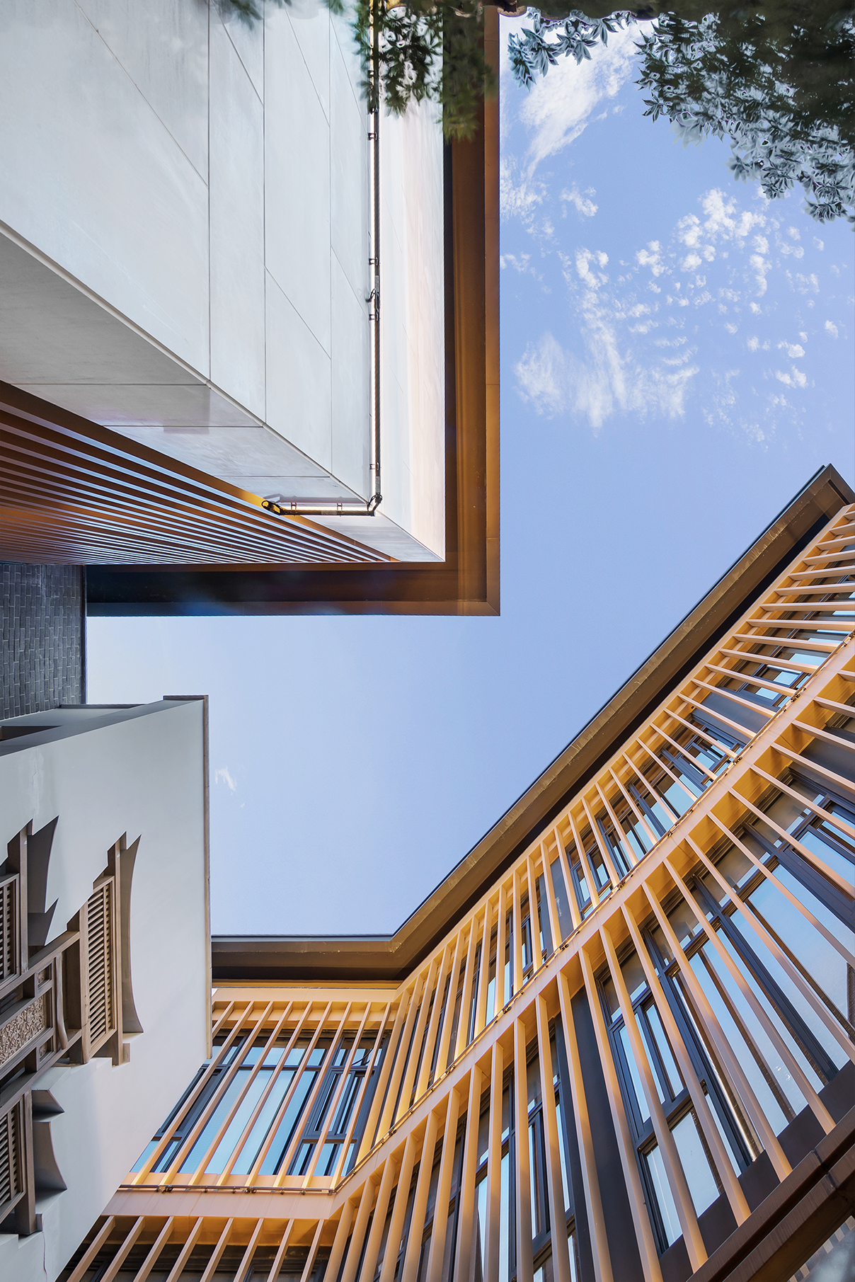 建筑形式錯落有致,使得每棟均有良好視野, 游走于組團(tuán)之間,仿佛置身于“廊腰縵回,檐牙高啄;各抱地勢,鉤心斗角”的傳統(tǒng)空間中。