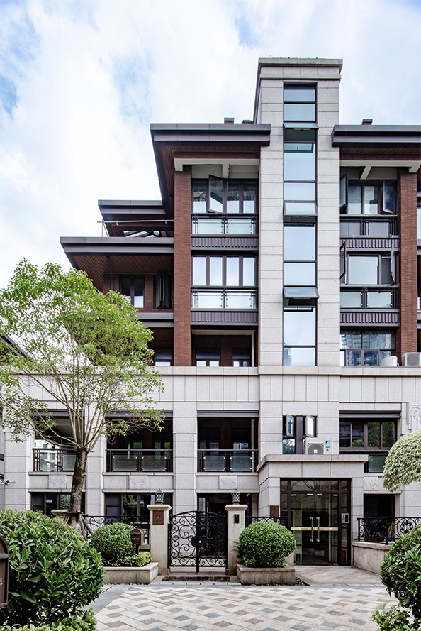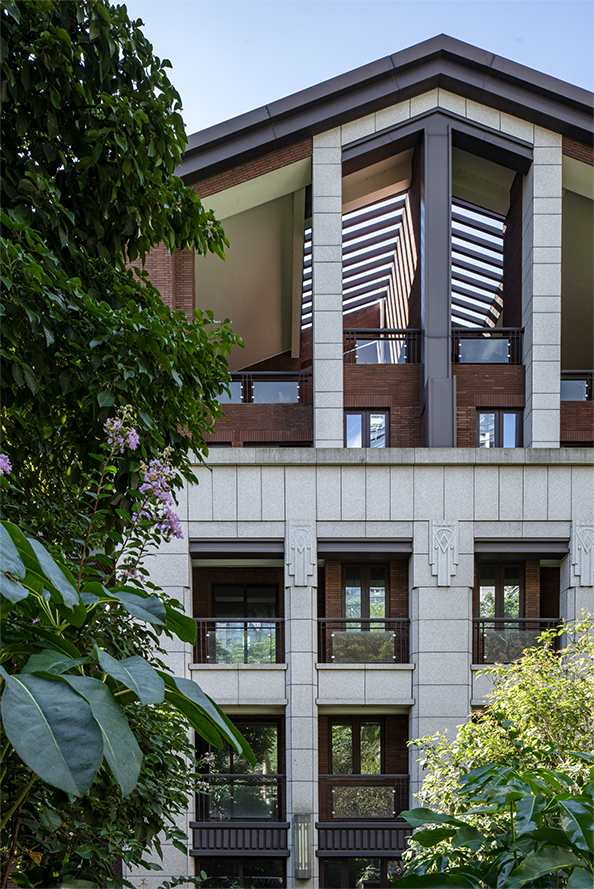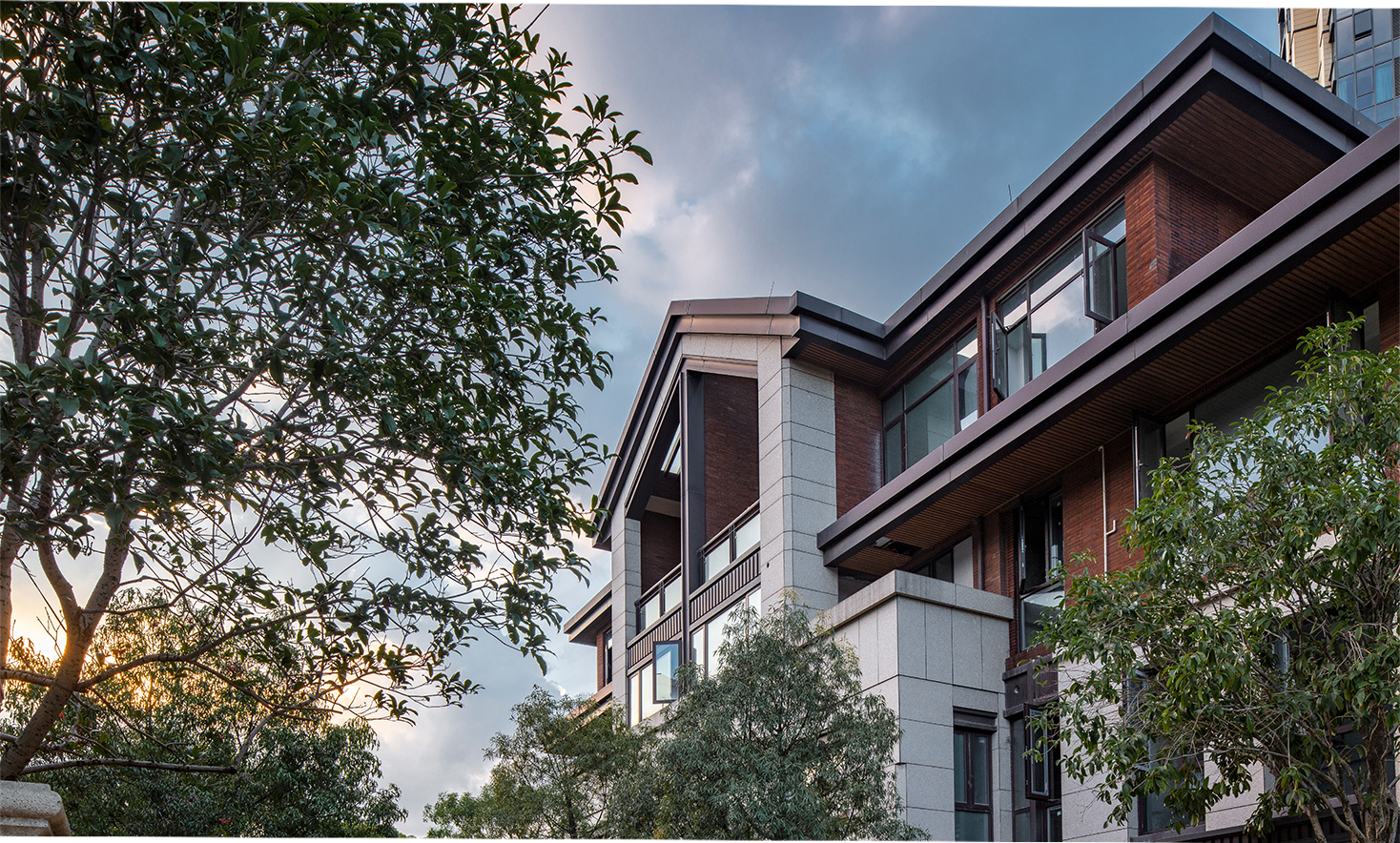 別墅區(qū)外立面選用"賴特草原風格",厚重的石材基座、磚紅色條磚、大尺度外挑的四坡頂均是風格重要的建筑語言。考慮到項目都市核心區(qū)域,立面設計中在風格基礎上多增加了建筑細部的處理,檐口的細部、檐底的木飾面、基座的石材細節(jié),讓"草原風格"別墅狂野的個性有所收斂。