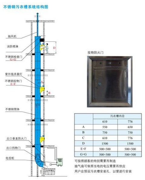 污衣井是采用進(jìn)口優(yōu)質(zhì)不銹鋼加工焊接而成。槽管以角形圓環(huán)接口結(jié)合,允許各層樓的槽管在高度上的尺寸和冷縮熱脹的情況。在每一層樓,槽管以鍍鋅鐵地臺(tái)固定架支承,并用螺栓錨固于地臺(tái)上。污衣井在所需的樓層提供的投物門(mén)為側(cè)鉸、雙層門(mén),可以加配電控門(mén)鎖,也可以人手操作。
